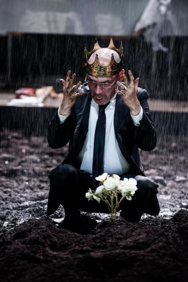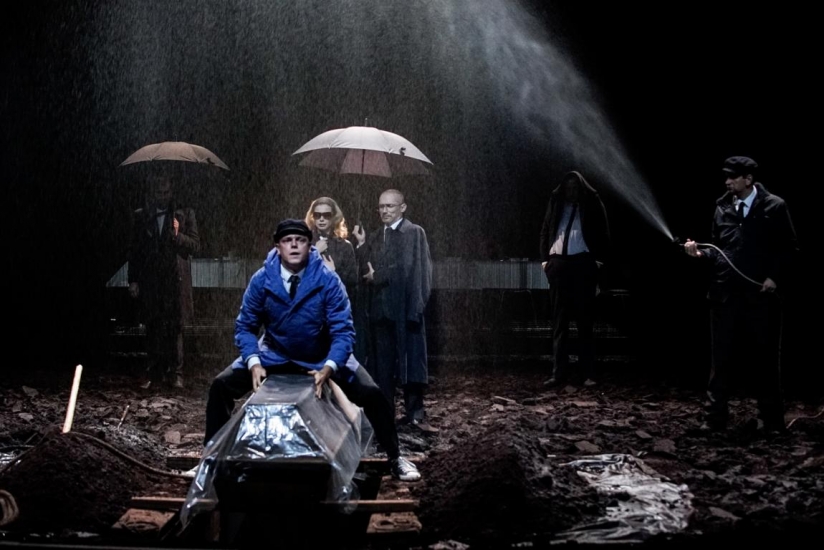 Although the original dialogue is translated into German, the physicality of the performers, combined with a visual spectacle and excellent soundscape, allows the story to come through without the need to read the subtitles closely. Director Thomas Ostermeier worked closely with translator and writer Marius von Mayenburg to create a uniquely German production that works with the sounds of the language (no verses here). Stunning moments are curated through clever projections and set design, technical elements which also test the actors to the verge of insanity. The script was ruthlessly cut and rearranged – sorry to any poor Yorick fans – yet still manages to captivate an audience for over 2.5 hours without interval. Parallels between characters are forcibly drawn to one’s attention through the use of double, triple, or even quadruple casting, as this was a small, tight cast of 6. Expected casting parallels like Ophelia (Hamlet’s unfortunate love interest) and Queen Gertrude (Hamlet’s unfortunate mother) are expertly played by the same actress, Judith Rosmair. Sebastian Schwarz, who plays Horatio is seemingly nowhere yet also everywhere, acting as rain-making stagehand, actor king, and part of the Rosencrantz and Guildenstern duo. The only constant is Hamlet, played by Lars Eidinger, whose eyes we literally see through.