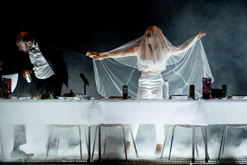 Hamlet skulks around the stage with a handheld camcorder intrusively pointing at every character, like a child playing ghost hunter. The camcorder feed is projected live onto large bead curtains that split the set between the dirt-strewn graveyard in the foreground that becomes progressively littered with garbage, and the sterile, white party table in the background that eventually becomes a blood-soaked carnage. The table occasionally bursts through the beads to bring characters into focus, before retreating behind so that conspicuous eavesdroppers may eavesdrop inconspicuously. Sound is designed with purpose, as actors interact with an onstage microphone to draw attention to who is meant to possess the attention, while personal microphones project the clarity of inner thoughts. Use of sound design and music creates unsettling, rising tension in the opening graveyard scene as all the characters stand in a tableau, watching a gravedigger wrestle with a coffin. Even music is interactable, as it can be commanded to stop and start. The fourth wall is constantly broken and built, not just by the set, but also by the characters as they walk into the audience to look for salvation. This playfulness with set and sound innovation balances the heavy emotions present within the play Hamlet, and the character Hamlet.