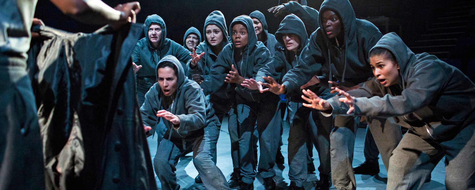 The inclusion of the sound of prison gates, a box of Krispy Kreme donuts, and the incredibly casual costume choices of prison-issue tracksuits and zip up jackets (with additional jackets thrown on to differentiate between characters) are all constant reminders of the production’s modern setting, effective in transforming the play. However, the incorporation of music at several moments throughout, particularly the heartfelt score accompanied by an acoustic guitar, is unwarranted and doesn’t suit the overall aesthetic established, instead disrupting the flow of the performance.