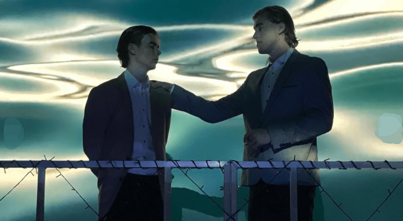 The set design team of Isabella Smith, Nicolai Skogstad, Amity Jacobsen and Peilin Feng accompanied the other elements decently, with few pieces save for chairs, tables, and- most strikingly- bunches upon bunches of hanging white roses, which added a dreamy ambiance to the show’s most romantic moments. I believe this aspect of production design was the weakest of the bunch due to its minimalism within such a maximalist show, but the crew’s originality still shone in their usage of the Guild’s projector. In using moving clips depicting backdrops such as running water and passing roads, they created pleasant scenery where background pieces couldn’t. Furthermore, the projections of the ‘The Eyes of Dr TJ Eckleburg’ painting, yet another subtle nod to the book and film, augmented more desolate scenes by creating an omnipresent feeling that the characters were being watchfully scrutinized for their decisions throughout the plot.
