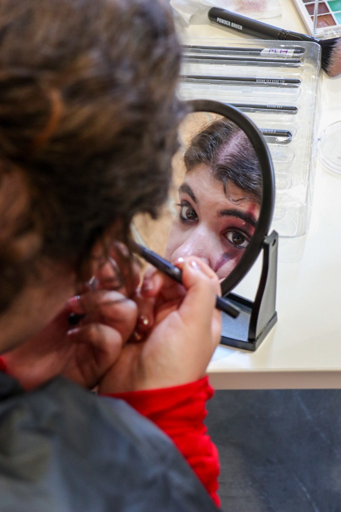 MP – Characters that are us? Not so much, ’cause we haven’t got a lot of time in between things to actually change — but we do have really, really good make-up. Our make-up artist is amazing. She’s got such a good vision, and everybody has really interesting make-up choices that make it feel a bit more theatrical. Even if I’m just wearing casual clothes, I’ve got epic green eyeliner.