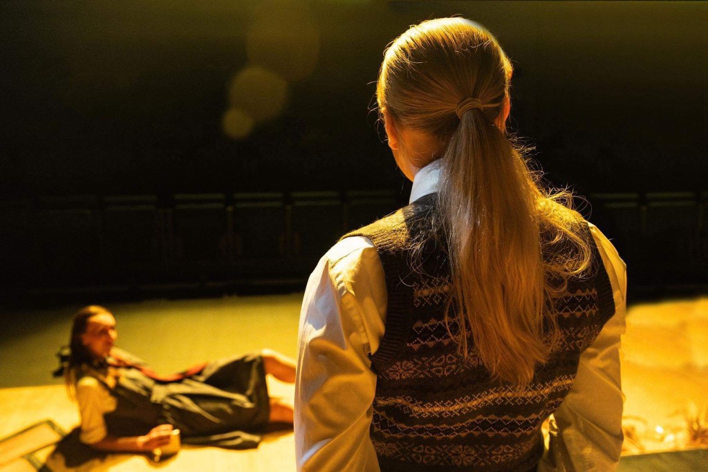 Costume designer Ellie Dean – whose consistently stellar work lies embedded throughout Picnic – distinguishes Michael visually, dressing him in a sweater vest and tie: almost aggressively English. In a production where the majority of other characters wear no prescriptive costumes, the five actors playing coach-drivers and policemen in school dresses, the effect is damning.