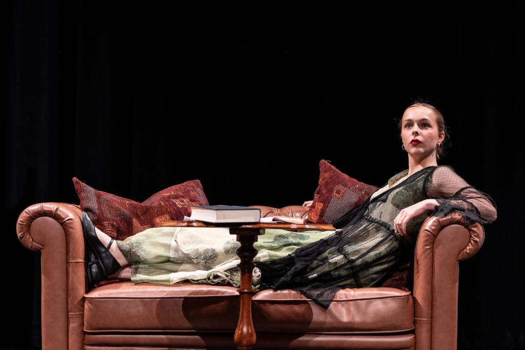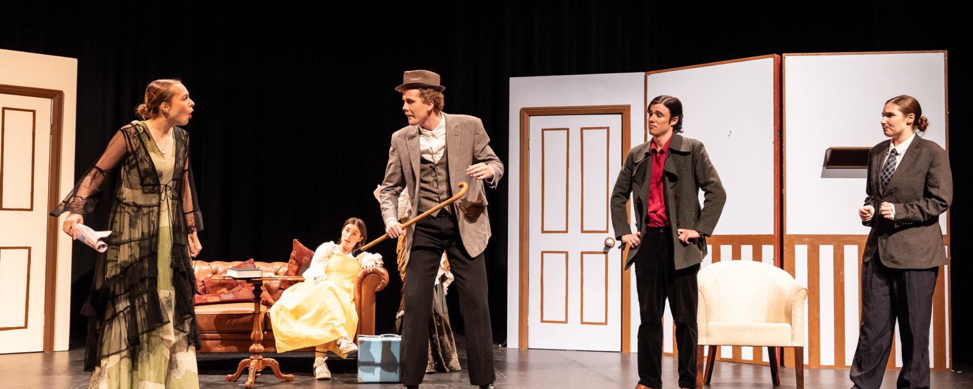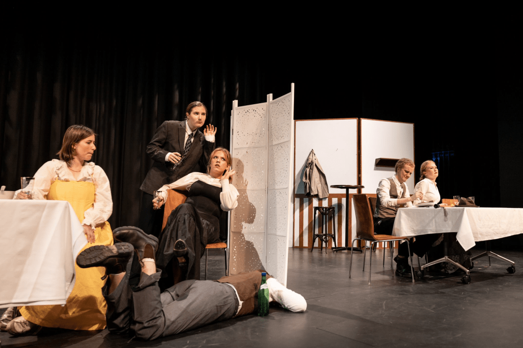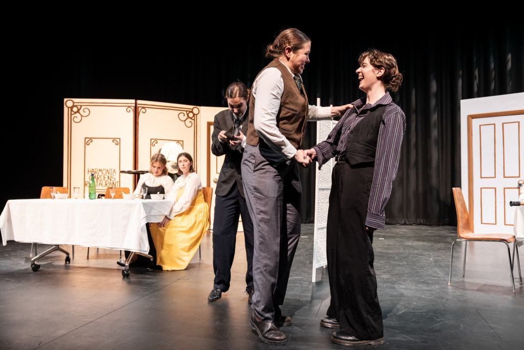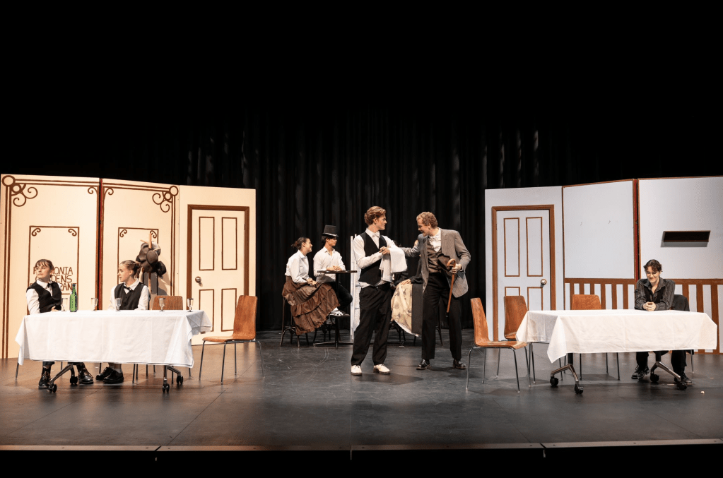 The Queen’s adaptation of The Matchmaker plays things pretty straightforward with its set design (Scarlett Alldis and Emilia Herrera). The flats that make up the background of the sets are simple yet effective at conveying each location of the show, be that the main characters’ house, a restaurant, or a hat shop, thanks to efficient additions of signage and shifts in placement of furniture. Most of the set pieces fit the 1800s timeframe nicely except, perhaps, the tables, which admittedly look like they’d been pinched from Market Hall. The lighting (Freddy McLoughlan) is mostly a wash for each scene, or a spotlight when various characters deliver asides to the audience. This sometimes made the action feel static, and could have lead to the odd awkward pause be unintentionally emphasised. The costumes (Clara Paton) fit the period well, and gave each character a unique look that suited them. A character like the niece Ermegarde is always seen in vibrant dresses, while her irritable uncle Horace wears muted colours in his shirt slacks and vest. There were certain scenes where it felt as though props were missing; – a wine bottle but no glasses, or an envelope with no letter inside, for example. Instead, actors had to opt for miming in these moments, and while this is perfectly fine in student theatre, the inconsistency of having props for some scenes but not others did cause a little confusion.