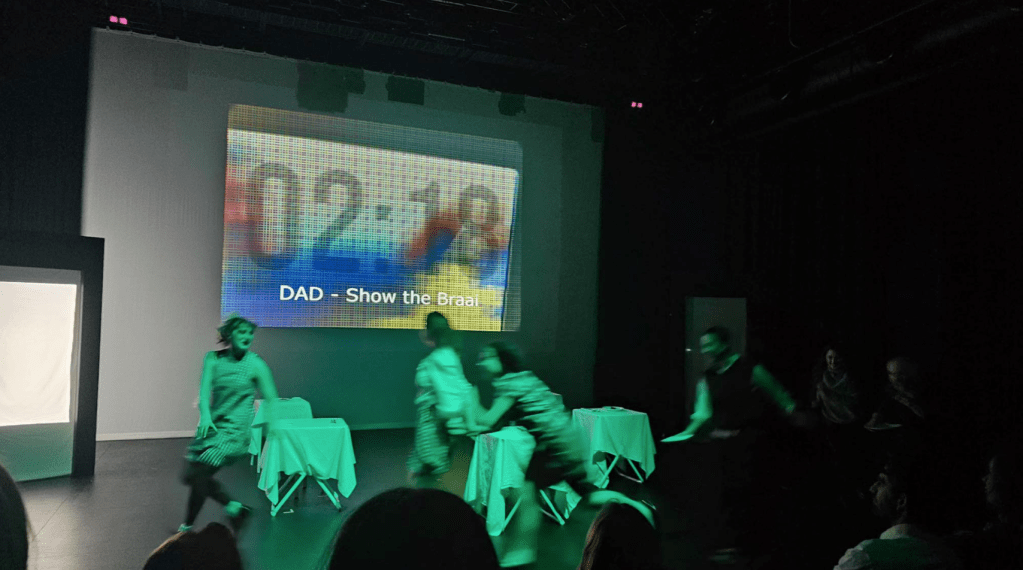 The multimedia really highlighted how production areas had clearly been thought out holistically. The grayscale costumes by Charlotte Vella, which made the past lives appear ghostly, were heightened by the bold colours on the cyclorama that lit up the stage. The lighting by Andrew Thomson was able to be fully utilised through the set created by Mary Scho as on each side of the stage sat a door frame with white fabric stretched across it. When light shone through the back of them, the actors were able to do shadow work, giving us an otherworldly way to experience Grace’s memories. The actors were also able to interact with the set in a ritualistic way. Each time a course was served, the five small dining tables were manoeuvred into a new formation, often to highlight one character to explore, as well as create hideaways for the character Gretta to disappear underneath.
