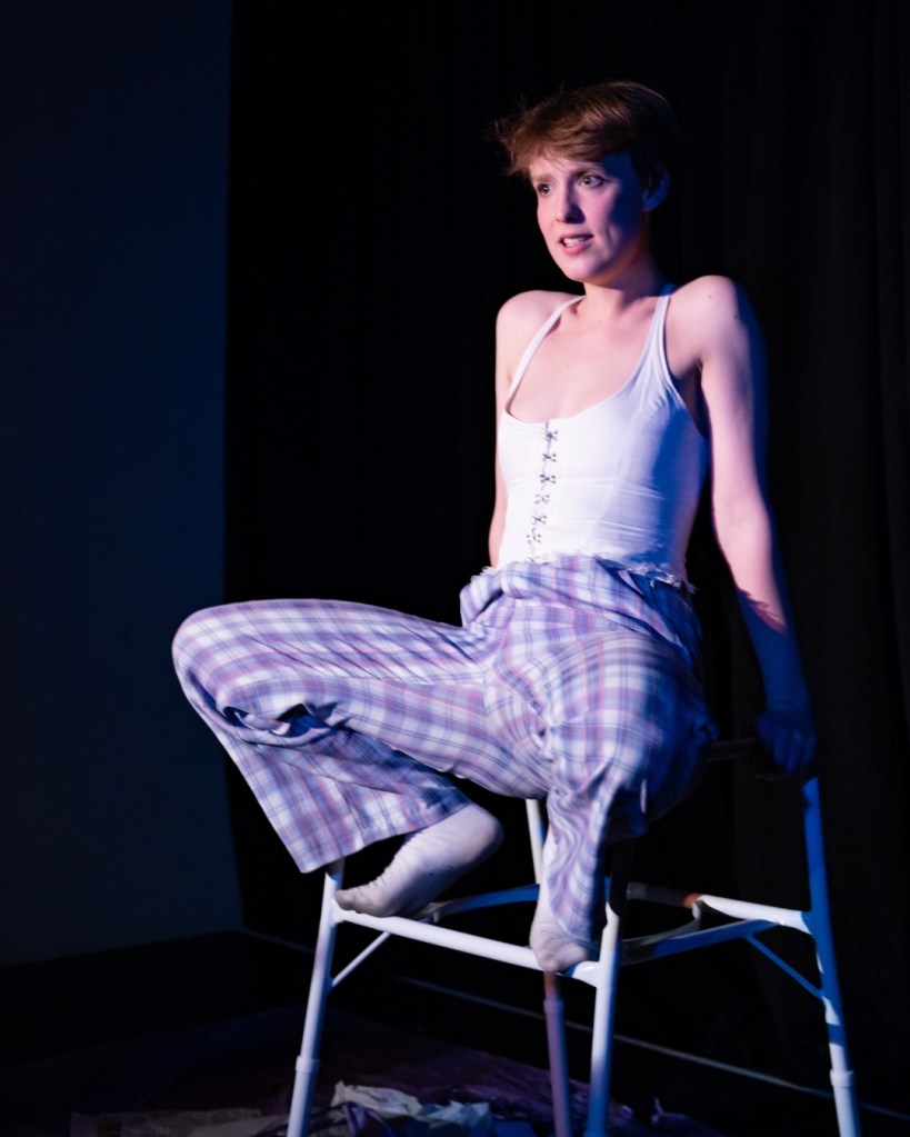 It is here where Justin Gardam’s sound and lighting design really hit their stride alongside some very skilled pacing from Edwards. Soaring classical music plays as Edwards recounts some memorable sexual encounters, with a thumping beat underscoring descriptions of highs and wild nights. Perhaps bisexual lighting (pink and blue) is queer theatre’s favourite lighting state, and in some cases it comes across overplayed. Gardam, however, nails this execution, splitting Edwards’ face perfectly down the middle with a jarring contrast of pink and blue. This was particularly visually striking when Edwards was discussing their relationship with gender. Pink and blue being the only colours incorporated into the lighting also drew attention to the little details in the costuming and props, which subtly featured a lot of purple – a lovely visual representation of fluidity.