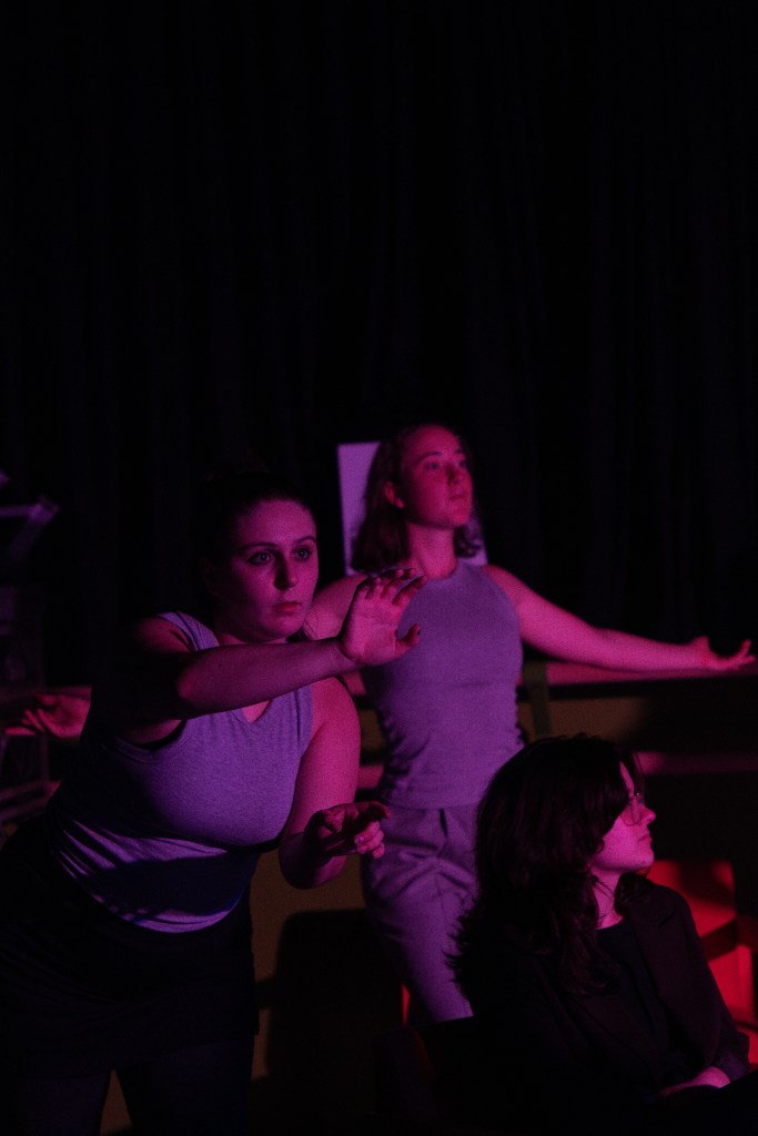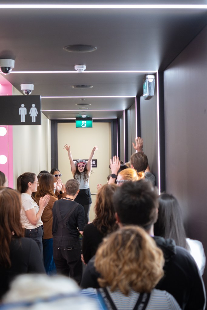In a clever contrast to the reflective scene prior, immediately a rambunctious and well-choreographed dance broke out in the Union House dressing rooms backstage as it became clear these were performers preparing for a much bigger show we couldn’t see yet. Performers who, during the dance, also desperately needed to go to the bathroom in a hilarious repeated mime that had members of the audience tapping on the bathroom door alongside them. It was striking how at this point the audience had fully invested in the performance and laughter inspired by this absurdity. We were along for the ride no matter what and credit should be given to the whole team as walking the line between chaos and sincerity is one few manage with the same focus shown in this scene.