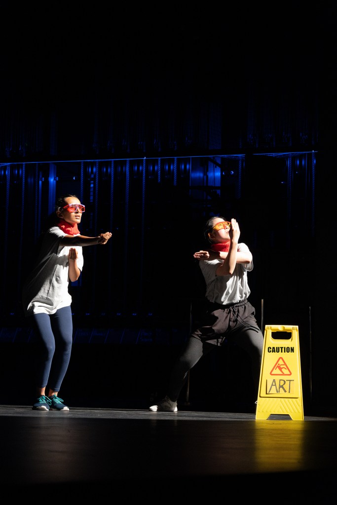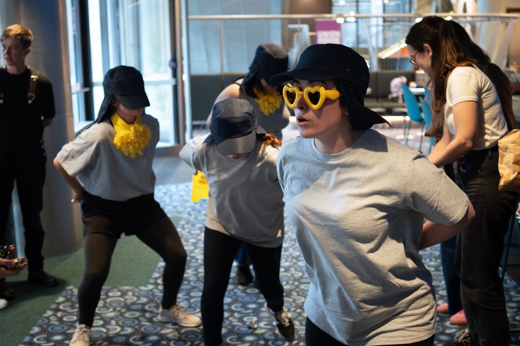 Over the course of eight days, an ensemble of students devised and rehearsed a playful and immersive work based on Po Po Mo Co’s “Body First” practice – where attention in devising is paid to the performers and their body with “words second”. The location on our tickets said Union Theatre – but before we could make it through the doors we were greeted with a parade of ducks. Performers replete with hats that resembled bills waggled into the study space to eat duck food, crumpled up paper, tossed from a delighted audience. The performers should be commended as being surrounded by not only audience members but also studying students could have been intimidating. Instead, their commitment imbued the moment with delight and a childlike sense of wonder and community.
