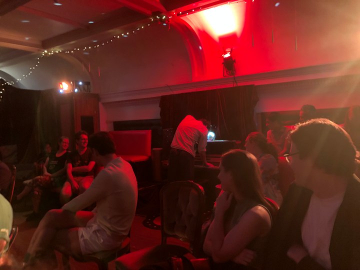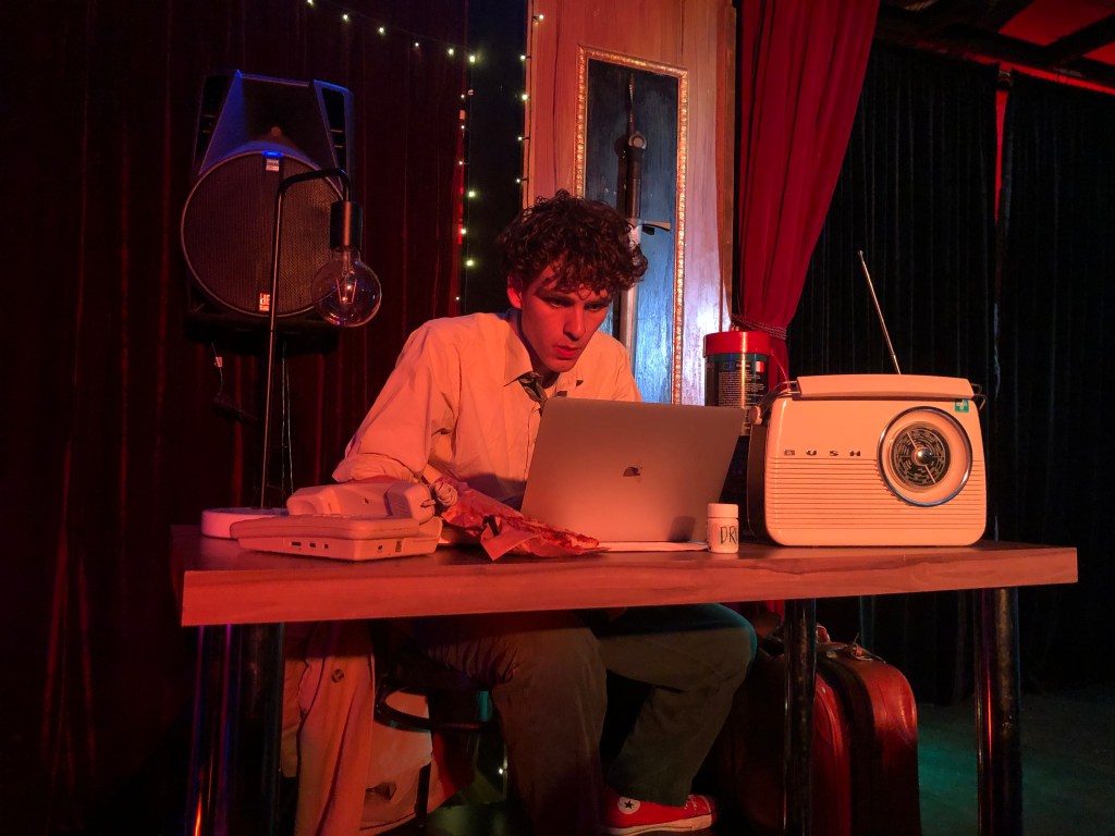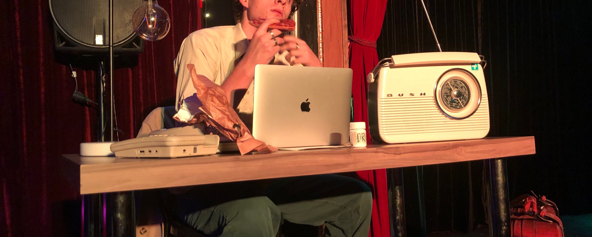 The Apollo’s Speakeasy Theatre is a perfectly suited venue, with worn velvet drapes, a sizeable stage, fairy lights and a cocktail bar. Jazzy noir music blares over the speakers as we take our seats close to Prandolini’s ‘office’, anachronistically kitted out with a retro radio, Monster energy drink, red Converse, and a MacBook. For the majority of Cold Case’s runtime, the show takes place within two distinct worlds: the office, where Prandolini begins the show by frantically getting into costume; and centre stage, where the show veers more traditionally towards stand-up comedy. Excellent lighting design theatrically spotlights the office while playing it cooler during the stand-up. As the show continues, lines begin to blur, culminating in confrontation, dramatic revelations, and many satisfying comedic payoffs.