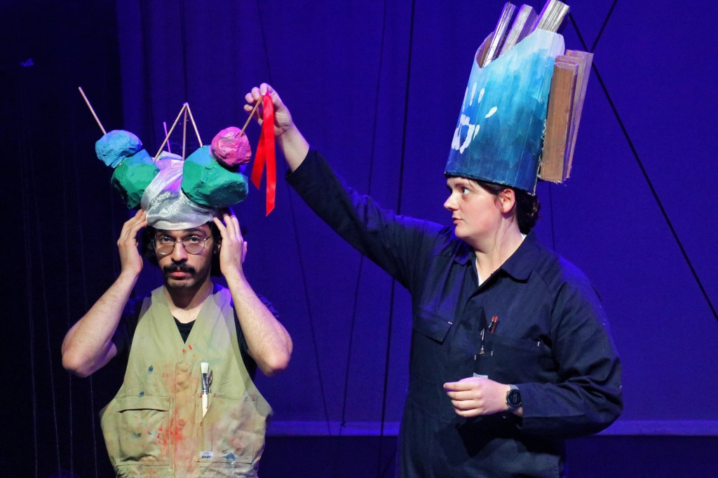 Fraser responds to this with acuity, delivering lines that prod, whilst maintaining a child-like obedience and deference that churns the stomach. Joan’s character is then brought into Act 2, 15 years on, where she meets Todd (Rouzbeh Nadjar). These two hold a connected dialogue, navigating disagreements, frustrations and moments of painful vulnerability all whilst crafting some pointedly garish hats. These hats (skillfully designed by Shannon Yeung) serve as a discordant focal point; their frivolity belies their real purpose, as adornments for prisoners with a capital sentence. Nadjar takes the floor in this Act, as a diligent milliner who either does not know better or who chooses not to acknowledge the ends to which his craft is set; these ambiguities are nuanced and expert.