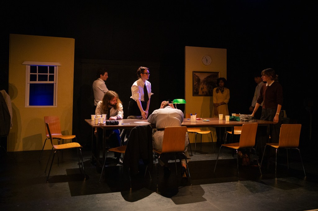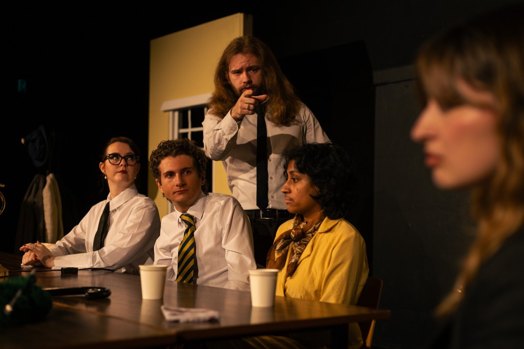 Juror Eight (Elena Stuckey) has one of the most notable performances in the play, being the initial juror that votes “not guilty”, who then attempts to share their perspective and analysis on the evidence provided throughout the case. Stuckey embodies the cautiousness and will of the character, especially in the dilemma of being ridiculed by the other jurors who consider the case “clear cut”. Stuckey’s subdued performance is contrasted by Dylan Gough’s explosive Juror Three. I especially loved how Gough maintains tension throughout the whole show, breaking apart with defeat in the final moments of the show. Kailen Missen’s Juror Seven and Paige Thompson’s Juror Twelve created areas for comedy throughout this very serious show, lightening the mood with their funny accents which is frightening due to their lack of consideration for the welfare of the young man on trial. Juror One (Leila Edelstein) kept everyone in control as the foreperson and was very good at being the leader-like figure for all the jurors. This was noted in how Edelstein was able to capture the terse nature of the juror, radiating a collected and controlling aura which manifested as affecting the other jurors. The softer performances of David Wang (Juror Two), Josh Drake (Juror Five), Ravindi Fernando (Juror Six), Madeleine Cheale (Juror Nine) and Keona Siaw (Juror Eleven) helped round out the cast along with the feisty performances of Jessica Harrison O’Toole as Juror Four and Charlotte Fels as Juror Ten. I must tip my hat to the whole cast for their interesting embodiments of the jurors as under the direction work of Francis D’Amour and Manson, as every character was unique, reminiscent of how a jury consists of people from all walks of life.