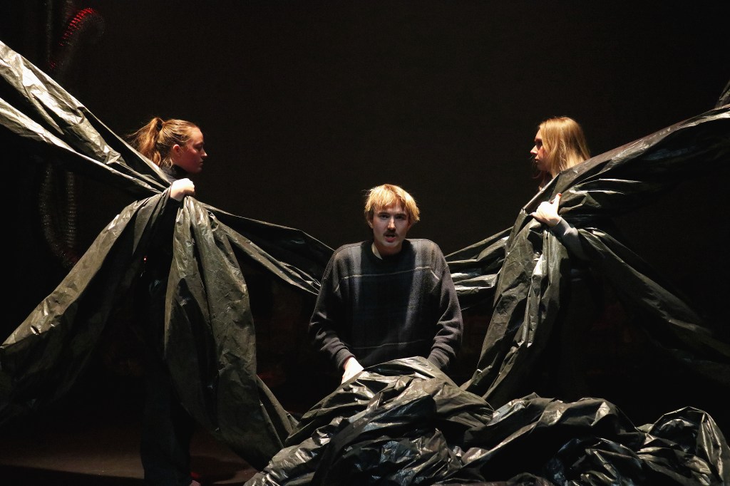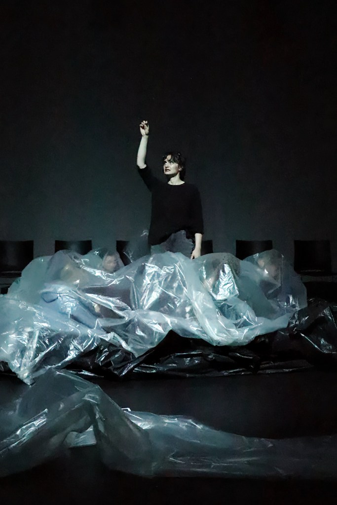 What proceeds is one of the most impressive opening sequences I’ve ever seen in my life, and I fear I won’t come close to being able to describe it in words. The ensemble emerges and we are introduced to another integral part of the set: a whole lot of connected bin bags. They span across the entire stage and are manipulated by the actors with intimate knowhow. They throw them over their shoulders, they knot them up and flutter them through the air. It’s chaotic yet highly controlled. The ensemble is mesmerizing and exact, no moment goes unwasted, directed by Gryff Connah and Emmaline May to a T. I wonder about the number of times they must have rehearsed the section, and it genuinely makes me tired at the thought. The strength of the ensemble, dramaturgically supported by Narii Salmon, is impossible to ignore throughout the entire show, but this is their biggest highlight. Once they pull down the plastic wall we’re thrust into the first monologue.