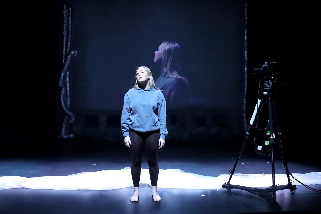 The closing monologue is performed by Cosima Gilbert, who directs it into a camera controlled by Lana Rosalea. The live feed is projected on the back wall, creating an uneasy tone as we see Gilbert from two different angles, sizes, and every so slightly different timing – the live footage being a few milliseconds behind. She lists what she sees as she scrolls through her phone, images that we’ve all seen in our own Instagram reels, evoking that discordant nerve we all have with the tension of swiping from genocide to someone’s beach proposal. It’s uncomfortable and yet we’re all stuck in the algorithm’s apathetic grasp. Gilbert looks at us and begins to ignore the camera; we are now part of this. We are stuck in the audience and the camera lens turns to us. I can see the top of my head projected on the screen.