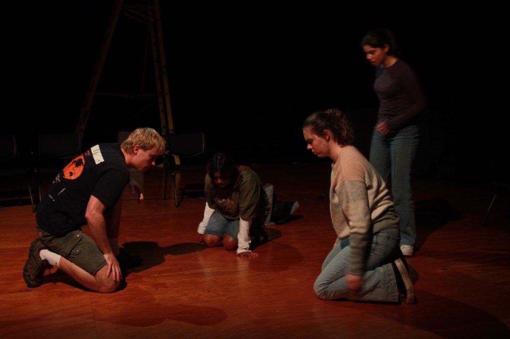 On top of the acting prowess, there are simple but magical moments of staging. There isn’t much room to do visual spectacles in the theatrette, especially when the stage is being filled with up to eight people at a time. They use the layout well, making sure to utilize the stage door the Motley has as well as the pathway through the audience. There is one scene in particular that struck me which is when they descend through a trapdoor. Instead of attempting to mime it realistically or just doing the classic everyone-jumps-as-a-group-and-says-we’ve-made-it-down! they line up, and one takes a step forward then is joined by the next and so on. It is simple yet extremely clean.