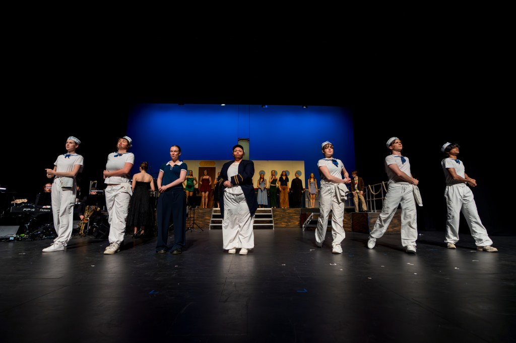 The acting was pin-point across the board as well. Harrison Abbott’s characterisation of Hope’s fiancé Evelyn, a stuffy British aristocrat, gave the character a playful likeability that was a delightful contrast to the brash, frenetic, and wonderful show-stealing performance by Ashna Sharma as the mobster Moonface Martin. Sharma sizzled with fantastic improvisations that were all the more brilliant for feeling so organic to the character. Of course, Harper Raverty shone as Reno Sweeney, with the confidence, charm, and the underlying good-hearted, world-wise attitude that is required for the character. James Mulcahy, Gemma Ashton, Niamh Morley, Felix Burns, Maddie Robins, and Grace Hall round out a very strong acting ensemble, who really make the world of the cruise liner feel alive.