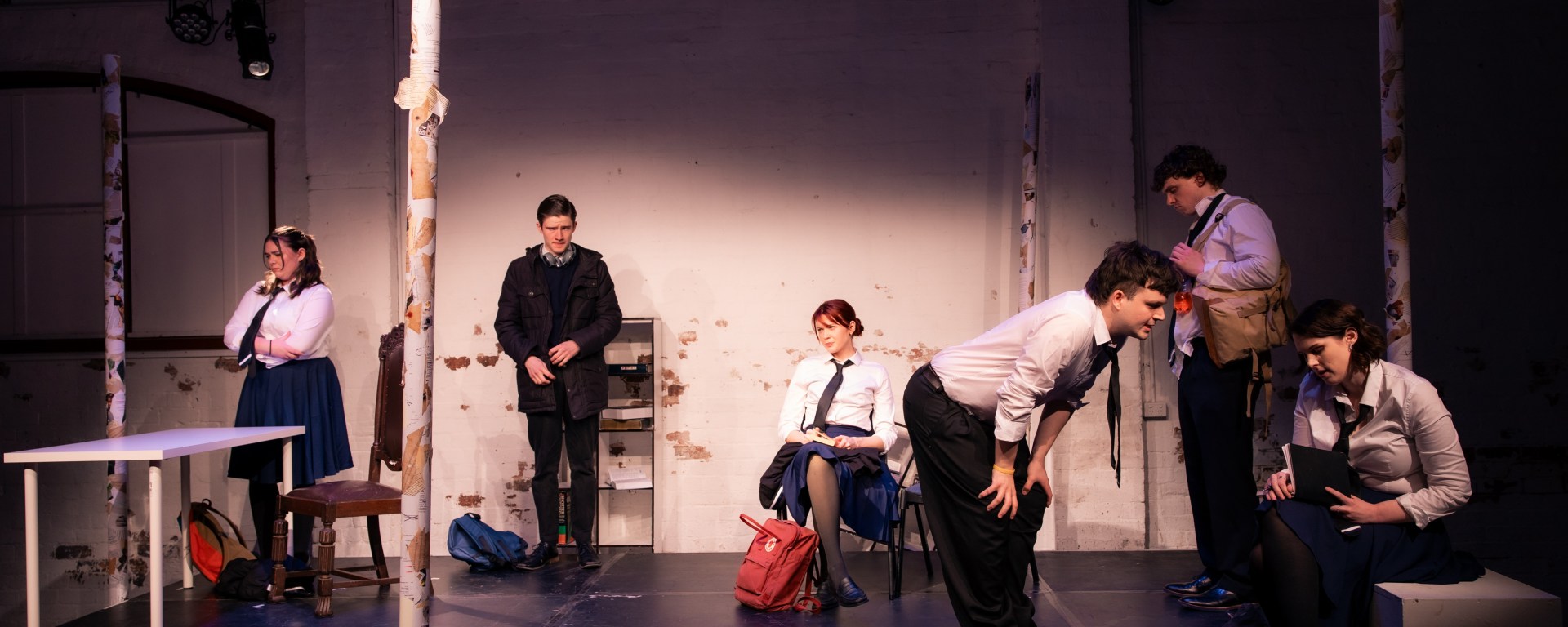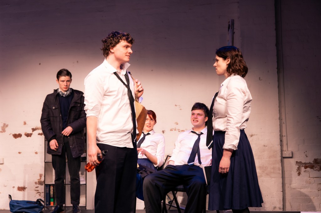 The set design by Sarah Ryan navigated the challenge of the oblong Meat Market Stables with a raised platform to represent a tight library at the top of the school. Raising the set isolated the performers which added to the intended pressure cooker of the original text. The furniture placed around the set allowed the actors just enough space to move as if it was genuinely a school space and at times effectively pushed the performers together. However, as the platform was hollow, whenever the performers stepped onto the stage the whole structure squeaked which – in the echo filled stables – sometimes overwhelmed the opening lines of dialogue. Similarly, I was perplexed by the additional pole attached to the edge of the stage and placed almost directly centre at the front of the stage as despite sitting at the centre only one row back, the pole obstructed my view of more than one critical moment.