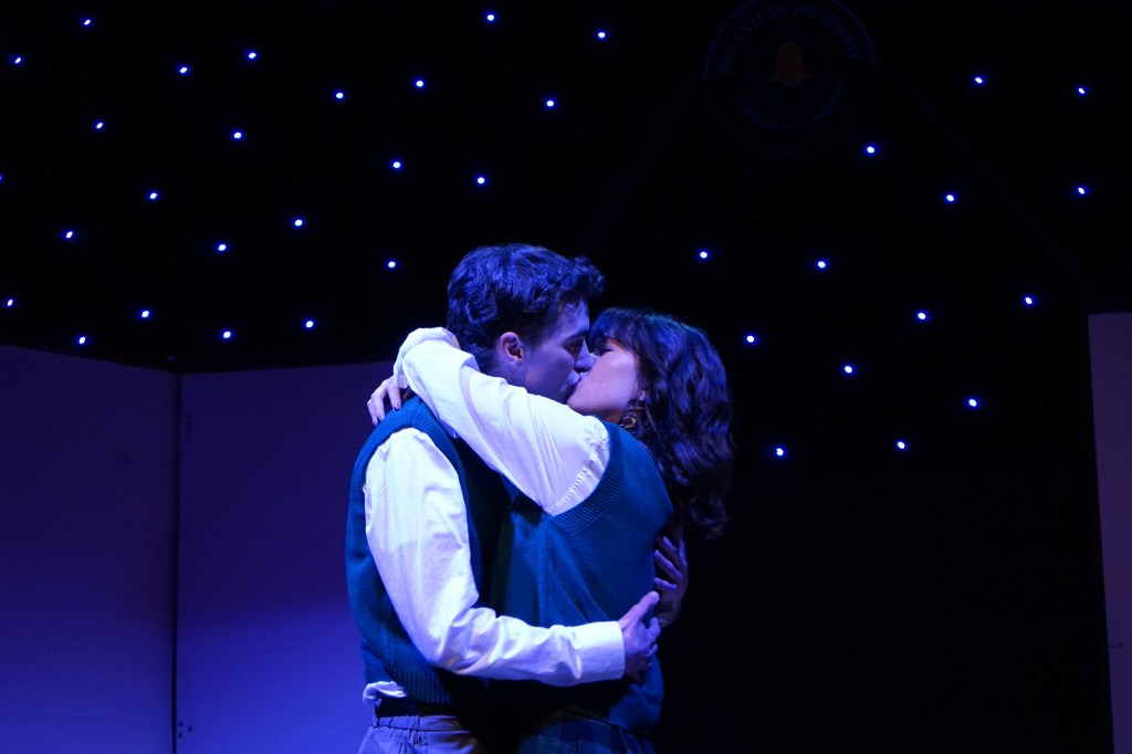 The romantic plot was another major element in the story, though for me it felt less fully developed than other aspects. With too many instances of love at first sight, they often felt unmotivated. While it is true that adolescent romance can be impulsive, its idealisation here made the work lean into the soap opera genre rather than a drama of rebellion. Act 1 lingered on romance, diluting the central theme of resistance against strict school rules. Repetitive dialogue about ‘rich people’ and ‘smart’ further framed James Finley and Veronica Hughes’s relationship as an old-fashioned ‘prince and Cinderella’ tale. Veronica’s identity seemed tied solely to being loved and recognised, which weakened her arc of self-discovery. Consequently, James Finley’s character also suffered. Despite Marcus Leder’s dynamic physicality, stage presence, and sharp rhythm in his opening scenes, by Act 2 his role had thinned into that of a rescuer. His impulsive actions read more as romantic ‘saving’ than as acts of defiance. This felt like a missed opportunity to deepen his role. As the leader of The Mutineers and a proactive figure within the school, he is a character who resents his father’s and the principal’s single-minded focus on authority and academic achievement. He carried far more potential than what was ultimately explored.