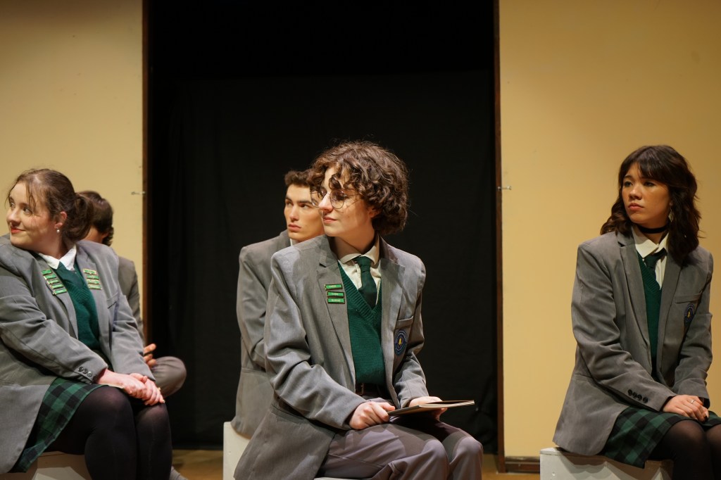The opening scene’s lighting (Jane Pekin and her team) and music (Sofia Jorgovic and her team) immediately transported the audience back to the 1990s, full of nostalgia and innocence. This beginning not only established a strong sense of era but also set the overall tone of positivity and youthful energy, highlighting the essence of a coming-of-age drama. The first standout moment came from the contrast between the two teachers: Mr Pierce (Sam Pringle) and Mr Hallward (Vedant Pithia). One stiff, the other flexible, their differences created a charming and humorous effect. The teachers were not presented as simply rigid or old-fashioned; instead, they were given lively and three-dimensional portrayals. Make-up and costume design (Marissa Chen, Abi Wood and her team) contributed significantly here, enhancing credibility while celebrating the actors’ personal characteristics and highlighting their endearing qualities — even while portraying adults.