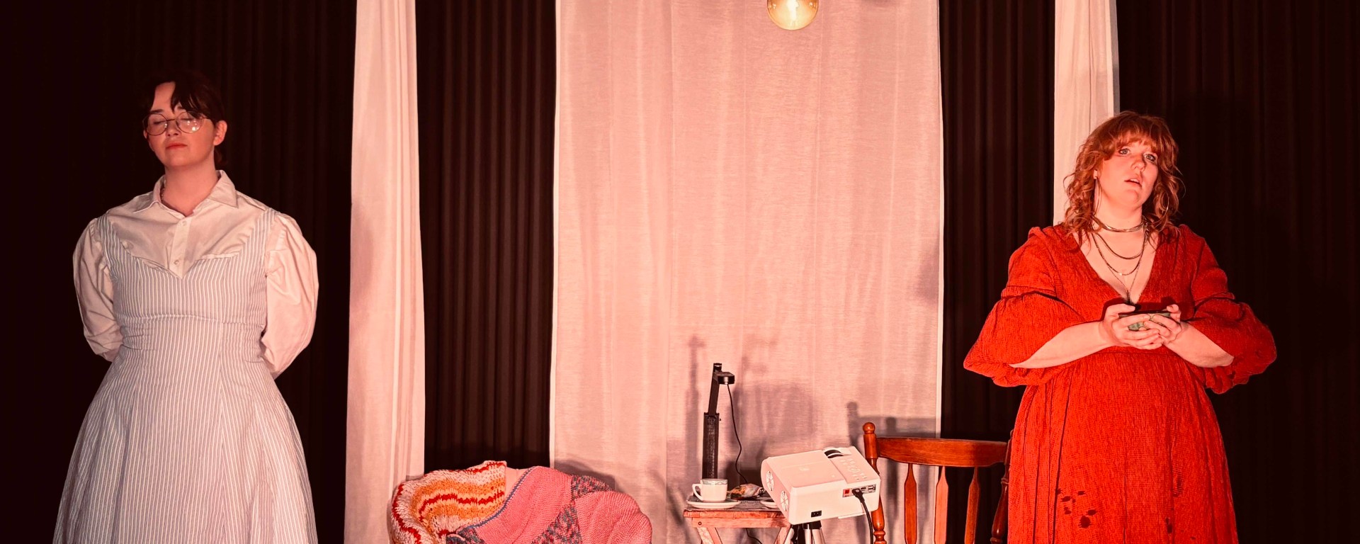 From the outset, the play announces its theatrical conceit: an imagined posthumous conversation between Ivy (Scarlett Rose) and Sylvia (Mia Boonen), their ghostly presences lingering in the very space they once served. The absence of a fourth wall makes the audience companions in their remembrance; observers and participants alike. Real news articles, archival records, and first-hand accounts are projected onto a white sheet using an old-school projector, transforming historical fragments into living dialogue. The simple staging (chairs, a tea set, and shifting pools of light) creates a sense of intimacy and immediacy. With only around forty seats, each performance feels like a confidential exchange, a séance of sorts, where memory and theatre intertwine.