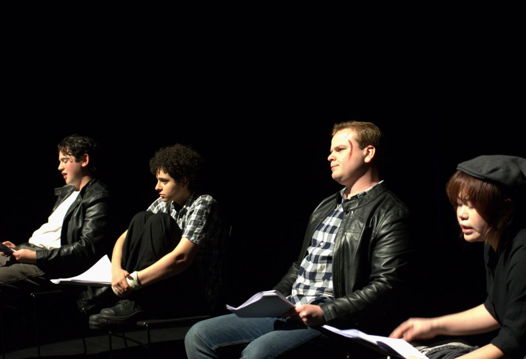 The lights – skilfully operated and designed by Irene Lu – dim to reveal interrogation-esque spotlights, and we’re quickly drawn into the world of Zagari’s Snakes and Straights. It’s anyone’s guess at first, but between rapid-fire statements and febrile declarations, it becomes clear that a murder has taken place: the murder of none other than ‘Ace’, the ostensible ringleader of Kingsley (Harrison Pinner), Quin (Tam Tran), Jackson (Ben Fox), and Tennison’s (Azmy) gang. Zagari’s script is fast-paced and witty; the actors spout white lies and half-truths, all the while interrupting one another and finishing each other’s sentences without hesitation despite their obvious separation (a nice dramaturgical touch).