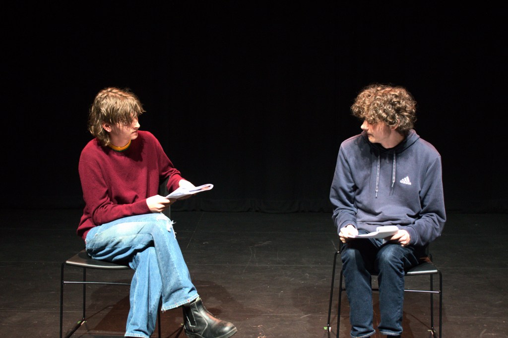 After some adjustments to the chair arrangement (two are taken, two remain), we enter the world of Look to Your Left, Look to Your Right. Oshlack conjures a much more introspective atmosphere as we meet the next two characters: protagonist ‘Boy’ (Samuel Pruscino) and the ‘Ensemble’ (Joe Mangan).