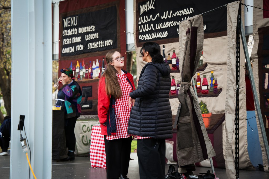 It’s not all love and war, though. The strongest part of SPRUIK! is its cohesive ensemble and cosy atmosphere. As Buden adeptly characterises every player within minutes of their introduction, the show feels nostalgic and comforting, without sacrificing the narrative. Costumes, designed by Claire Black, along with hair and makeup by Hannah Crompton, impressively heighten the production design – colour schemes, outfits and hairstyles are certainly realistic, but nevertheless carefully thought out. These aspects inform my comparison of SPRUIK! to a really good sitcom. We’re treated to spit takes, comedic character reveals, and endlessly entertaining ensemble antics, my favourite being: pedestrians’ Fabian Jones and Lilith Lee’s old couple; and Ada (Akshita Benny), a younger spruiker, with an obsession for fidget toys and lemons. Completing our cast is the senior restaurant staff: Riley’s boss and Ada’s uncle, Yusuf (Oliver Qubrosi) and Staz’s boss Tenzin (Crystal So), both with a charmingly gruff exterior that isn’t that hard to pierce; Tenzin’s coworker and chef Helen (Fifi Diberardino); and her husband, Carlo (Josh Petrenko). Qubrosi, So, Diberardino and Petrenko are frequently eliciting big laughs from the audience, with comedic chemistry in spades. I find their dynamic both realistic and heart-warming. As the minimum wage stagnates, prices skyrocket and occasional drink on the job is offered – all painfully relatable aspects of Carlton hospitality – SPRUIK! chooses to lean into the more commendable aspects of the community, and instead of playing up a rivalry between the restaurants, highlights their mutual respect and willingness to look out for their families and each other.