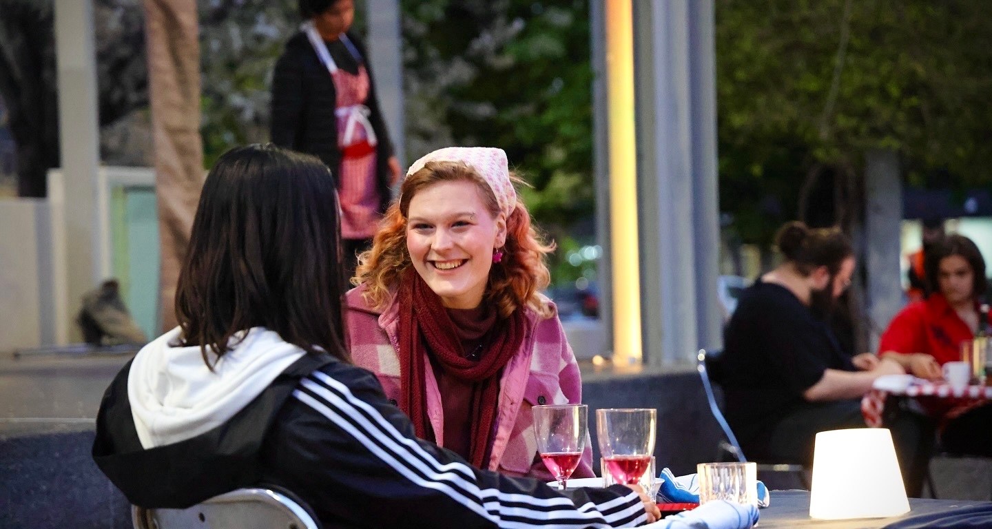 Writer and producer Josie Buden is, according to their bio, ‘convinced the age of the heterosexual rom-com is over’. I have to say, it’s hard to name any recent romantic comedy as funny and feel good as SPRUIK!. On Lygon Street, three queer love stories develop within two restaurants, over the course of one evening: Casey (Percy Mangiafico) and Athe (Poppy Treadwell), senior school best friends, and March (Freyja Knutsen Craig) and Chloe-Rose (Sabrina Lee), on a first date from hell. Treadwell and especially Mangiafiaco adorably capture the nervous love-struck energy between their characters, whereas Craig’s bubbliness and vulnerability hits hard against Lee’s gleefully toxic portrayal of an arrogant playboy. These two couples work alongside our romantic leads – Riley (Abigail Liptrot Spillane) and Staz (Iva Lilly) – as the central source of dramatic tension and resolution.