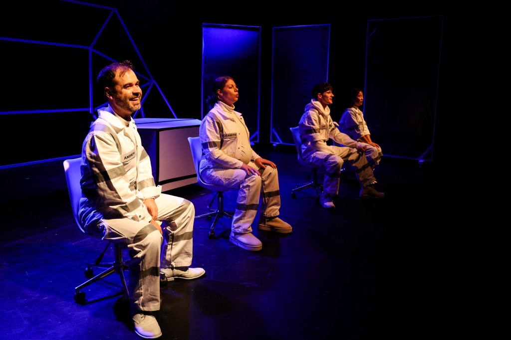 The sound and lighting (by Lili Wymond and Tomas Gerasimidis respectively) were excellent, particularly in the way they interacted with each other. In the first act, contestants’ answers were met with either a green or red light, accompanied by a positive or negative siren, which highlighted the artificial nature of the reality TV show and the emotions it created. I also found that when the space pod went into shutdown, the solitary yellow floor light created the sense of an industrial, mechanical environment. The music generally was ethereal, with synths appropriately evoking a technological future, while the inclusion of more conventional songs helped smoothen the transitions.