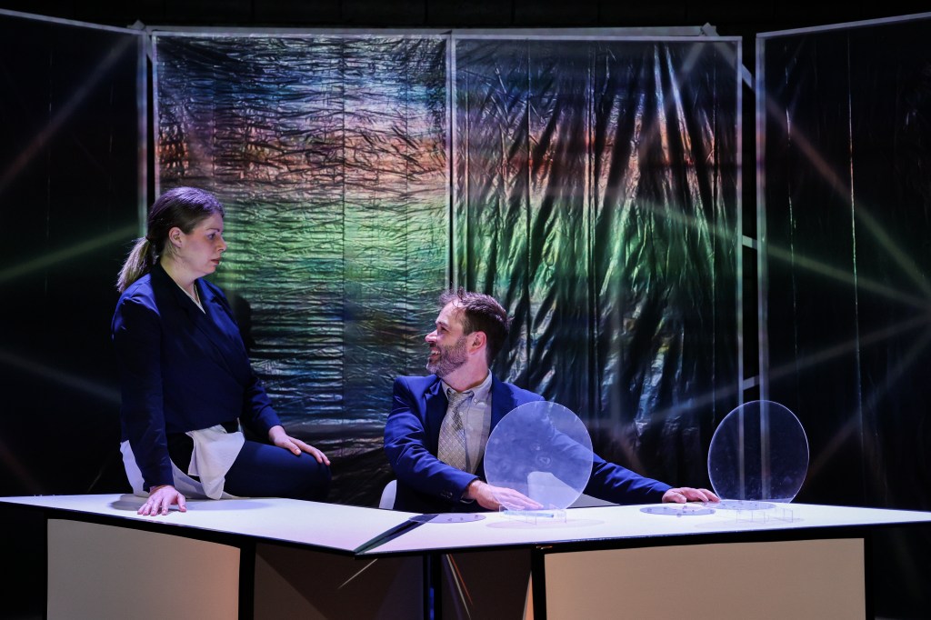 Lastly, Seon Williams shines with arguably the greatest variety of characters across the three acts. As Laura, her faded pop princess in Act One feels utterly relatable in her growing disdain for the reality TV show, yet remains unflinching in her ability to ‘switch on’ for the camera to elicit a positive response from the ‘Big Brother’ Astro Lady (Emily Shelmerdine). In Act Two, she embodies the office gossip as Caroline, highlighting the fatigue that comes from working a bureaucratic job. As she clings to any rumour, it feels almost as if she is seeking relief from the drudgery. This is further complicated by the slow reveal that she is actively deleting people’s memories – for a price. Williams makes this shift feel like a natural extension of the character’s interest in gossip, probing clients attempting to delete their memories with questions. Finally, her role as the android Esta, who grows increasingly human across the third act, is beautifully performed. Her rigid movements and speech reinforce the audience’s expectations of an android, before being gradually undercut by her increasingly personal statements and questions. The character gains a tragic, child-like innocence as she declares that she has begun to have dreams and that she wants to learn how to fall in love.