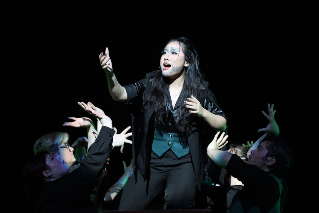 The formidable Board – where to begin. Each actor embodied a farcical parody of their position. Amelia Lau’s Conrad, the chair, was superbly cunning. Bronte Lemaire’s HR Rep was an expert in the customer-service-Barbie voice, always smiling and ready with a ‘solution’ to each problem. Paige Thompson’s creative director was always deep in thought, the faux-French accent adding to her sophistication and a constant reminder that she is better than us. The intern, Declan (Phillip Lee), was constantly trod on and mistreated by the others until he fought back in a spectacular musical number. Leah Wang and Hugo Douglas, too, embodied their character’s position within their musical numbers. ‘Whistleblower’ and ‘Victim’ were villain songs for the ages.