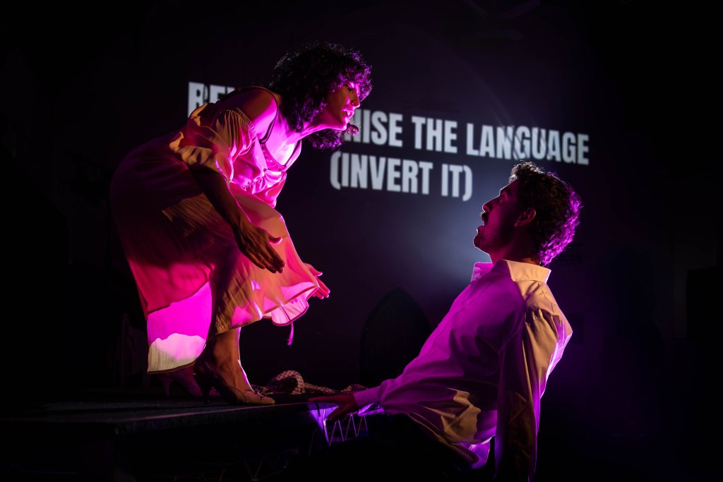 The play is structured through vignettes where each tackles a revolutionary idea, displayed aggressively through its projection on the back wall e.g. REVOLUTIONISE THE LANGUAGE (INVERT IT). STOZ’s sound design gives me a jolt every time it changes, drawing my eye to the new message as well as giving me a disruption to my nerves. STOZ’s sound design switches from subtly underlying an entire scene to being the joke itself like a reactive sound board in the best way possible.