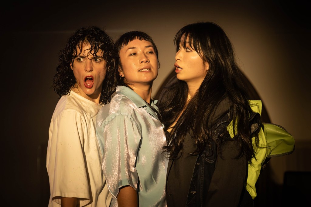 Throughout the show, O’Brien-Brown’s lighting design is as blunt and direct as the script. The lighting set up itself is simple yet incredibly stylised and sharp. Using colour and spotlights to lean in on strong lighting choices instead of subtle which is cohesive with the tone of the play. Additionally, by solely focusing the lighting on each of the three stages, the ground between becomes a limbo space where actors who aren’t in the scene can watch or where the actors can step out of the scene to ruminate on what they’re doing. One of my favourite examples of this was when AYA physically steps off and out of an incredibly traumatic scene where they have been yelling the details of their mother’s abuse and asks the audience if it’s too sexualising. The choice to not light AYA in this moment amplifies the limbo between character and actor.
