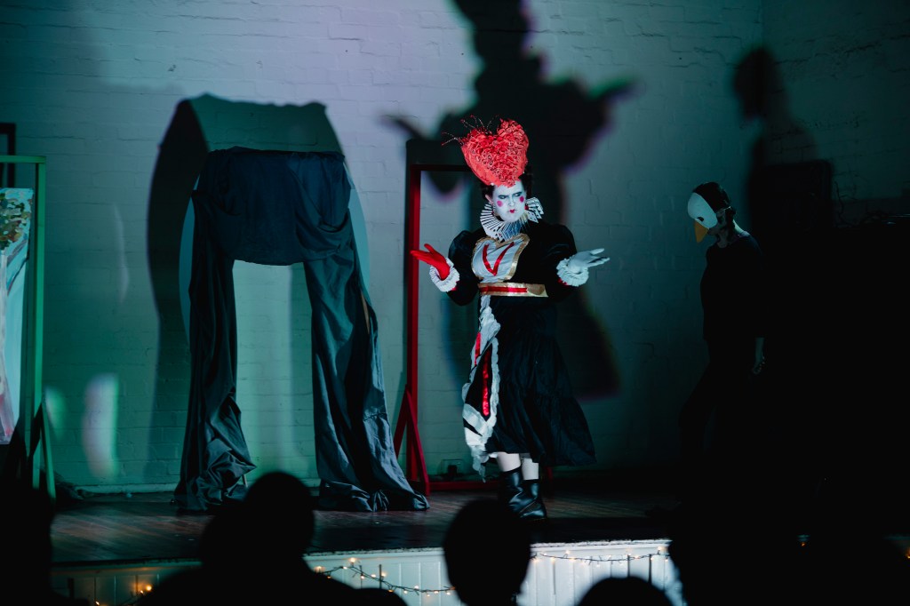Lighting by Nancy Yang made the best of a very basic lighting rig which consisted of 2 color-changing LEDs and a string of fairy lights. With minimal lights, which limit the different spaces light is typically able to create Yang successfully uses colour to show shifts in location and mood. Yang doesn’t shy away from bold saturated colour which keenly reinforces the absurd reality Wonderland creates. The world building is furthered by sound design by Jordan Overs and original score composed by Stella Byrne. Overs and Byrne work seamlessly together to create the flowing ambience of Wonderland. With nothing but a large Bluetooth speaker and a QLab file, the whimsical world is audibly heightened, and with the rain the venue was graced with on opening night a cosmic coincidence I honestly thought was part of the design.