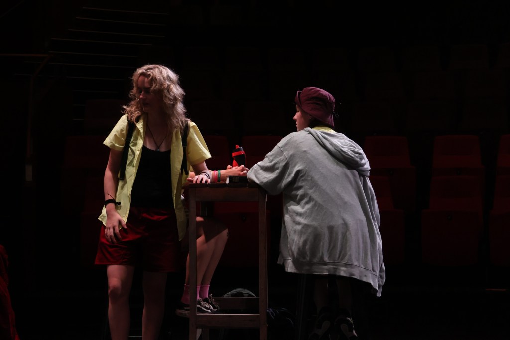 CJ Bu Blêt’s set has a DIY aesthetic very evocative of a public school art room. Decked with nature-themed wall art and hanging art projects, with one door in the centre lit with blood-red lighting, walking into this setup really feels like entering a chaotic crime scene. Jason Sridher and Leaf Rynehart’s lighting designs and Harvey Lansley’s sound designs were also very atmospheric, smoothly capturing the emotional tensions within the room.
