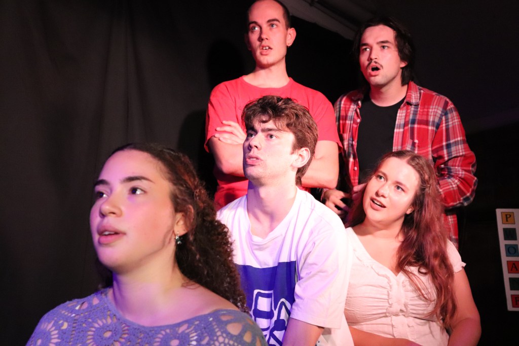 The six performers work as a tight ensemble, with witty, overlapping dialogue punctuated by well executed moments of movement. I particularly enjoyed the training sequence; the two households practicing questions as they slipped in and out of freeze frames. The choreography and focus of this scene were impeccable, and as the characters orbited each other, it genuinely felt like I was watching a juggling act. The clear cast cohesion was complimented by a brilliant use of space, the cavern of the Motley Wherehaus transforms perfectly into a cramped share house living room. While quite an intimate venue, the cast should be commended for their ease and coordination while navigating the space, the proximity allowing for a great immersion in the narrative and some golden moments of audience participation.