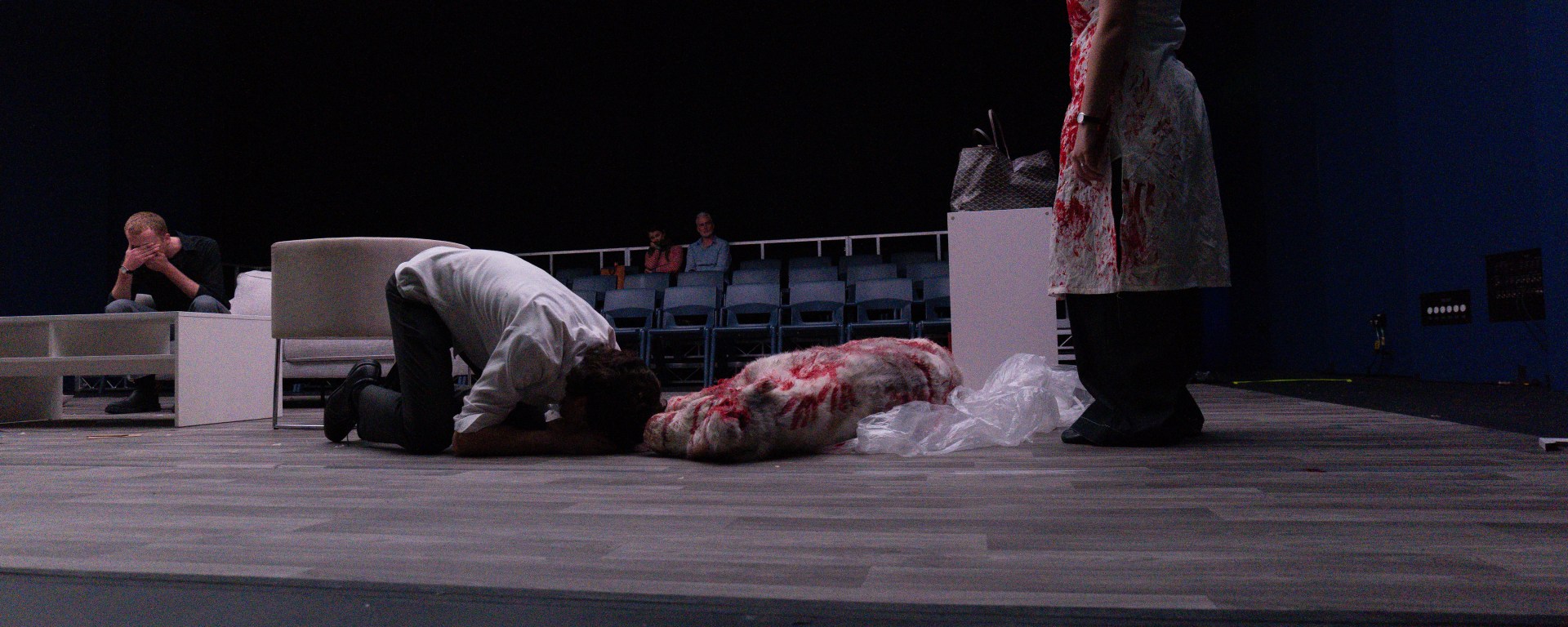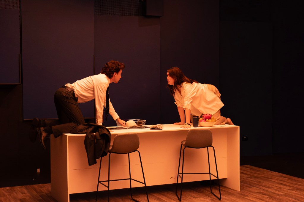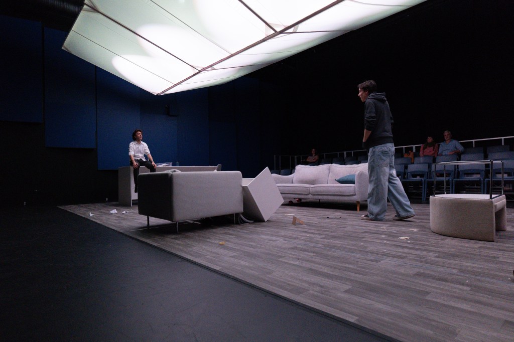 The lighting, designed by August Johnson, was a particular standout for me. A panelled scrim is hung from the ceiling which diffuses the lights into a stunningly cinematic and flattering wash. Working in conjunction with set design by Georgia Campell and Declan Duffy, having a roof created the sense of a full box-set and a realistic home. I have also mentioned the audience being lit. Usually a traverse is used to encourage an audience to reflect on themselves and their reactions to the action onstage, but in this case, there was an additional sense of voyeurism. The lighting augmented this with its subtlety. I truly felt like a fly on the wall. There was also the added drama of occasional bright red washes to separate scenes, which raised the stakes, coming to a head in the final image of the show. Campbell and Duffy, assisted by Alexandra Fimeri, created a set that wonderfully responded to the intimate space of the Union theatre and spoke to the privilege of the characters. Pops of red detail the set, an underlying promise of violence. Tina Vuong and Elsie Craigie, prop and costume designers respectively, tastefully brought the production into the modern day. The costumes were simple and stylish, timeless, but not anachronistic. I was absolutely captivated by the fact that Stevie, in scene one, pulled a pair of cloven-hooved tabis out of the drawer (foreshadowing…). Vuong’s smashable props were unforgettable. A vase dropped and exploded, shards skidding into the audience in a moment that was dramatically chaotic, but also completely controlled. I would also like to specifically throw some praise to Rebecca Fortuna, intimacy coordinator, for creating some particularly harrowing moments, and the marketing team, Campbell and Lucy Xan Fu, for advertising the show with such visually distinct and symbolically rich imagery.