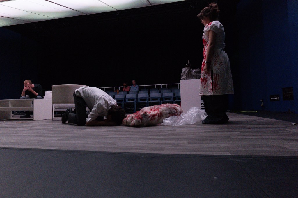 Nastri’s portrayal of Stevie is heart wrenchingly powerful and nuanced. Even in her most high intensity moments of rage, she does not lose her grounded and intelligent delivery and does not once slip into one-dimensionality. Ross, the blokey best friend of Martin, is played by Connah with relish and charm. Connah’s gravelly voice and casual gestures created a hilarious and confronting contrast to the subject matter. Yet Connah expertly navigates the tonal shifts of the performance in his later entrances, smoothly becoming a grave and grounded voice of reason. Brett plays Billy with an endearingly vulnerable anxiety. The play text makes clear Billy’s concern for his mother, and Brett does a fabulous job of appearing nurturing and protective of her, a strangely sad reversal of a healthy family dynamic. Brett does not shy away from the ickier complexities of his character at any moment. Even in silence and stillness, his unwavering gaze on Martin in the final scene was bone chilling. McBurney’s interpretation of Martin is, as I have mentioned, seemingly sweet and innocent. I found myself extremely drawn in by his lovable insecurities. It made it believable that he did not believe he had done anything wrong. McBurney’s almost ditzy demeanour even in the face of unbelievable tragedy onstage spoke to a great ease onstage and a deep knowledge of the character. The whole experiential and symbolic throughline of the show relied on the exact balance that he was able to find. The script is not only difficult because of its themes, but because of the language that oscillates between poetic and hyper-conversational. The cast carries it off beautifully. My favourite element of textual delivery is that the word ‘Goat’ is never stressed in a sentence. It seems to sometimes float by, without fanfare.
